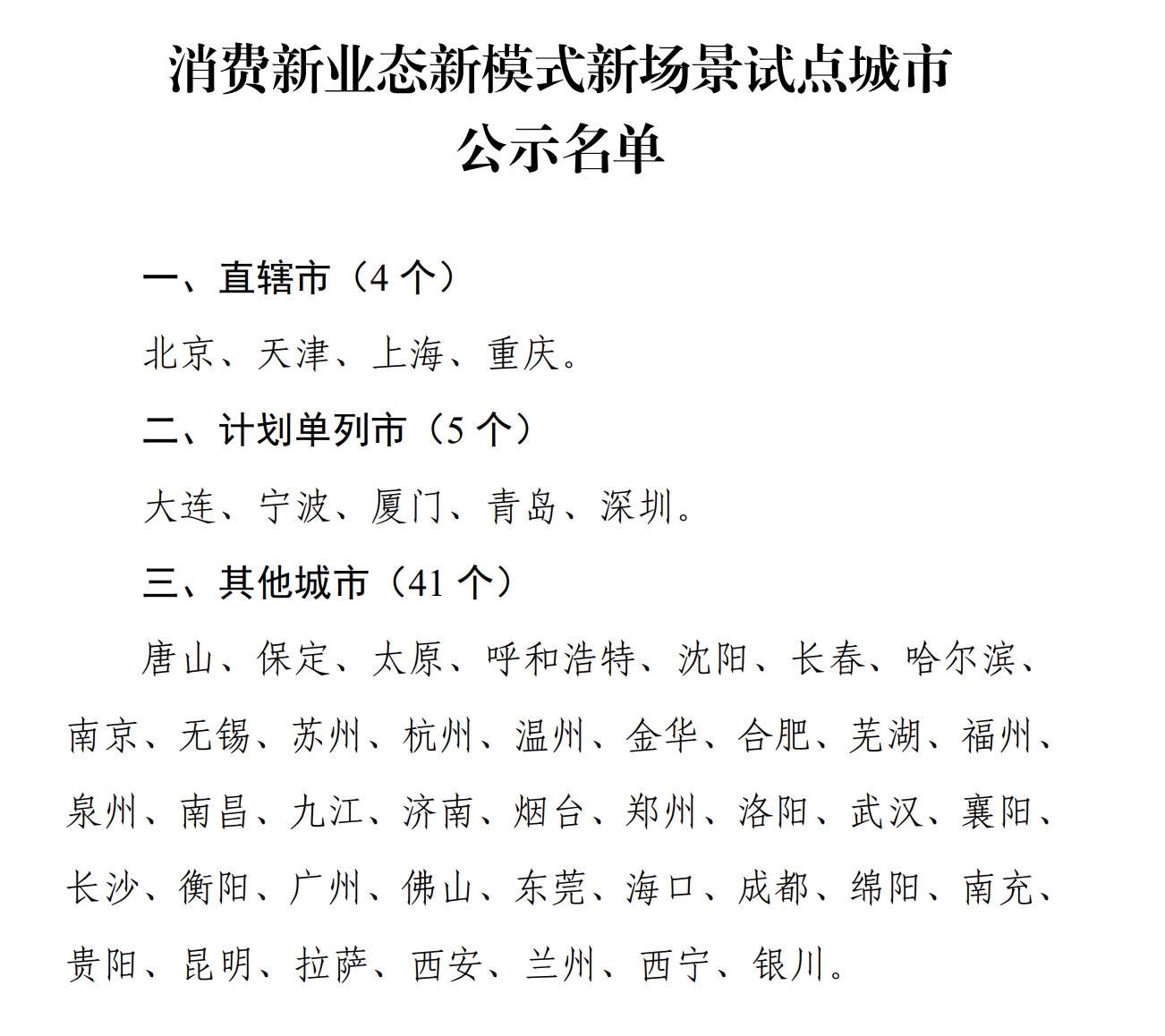 财政部11月20日消息,财政部、商务部公布消费新业态新模式新场景试点城市竞争性评审结果。公示名单共包含50个城市,其中有直辖市4个,包含北京、天津、上海、重庆;计划单列市5个,包含大连、宁波、厦门、青岛、深圳;其他城市41个,包含唐山、保定、太原、呼和浩特、沈阳、长春、哈尔滨等。