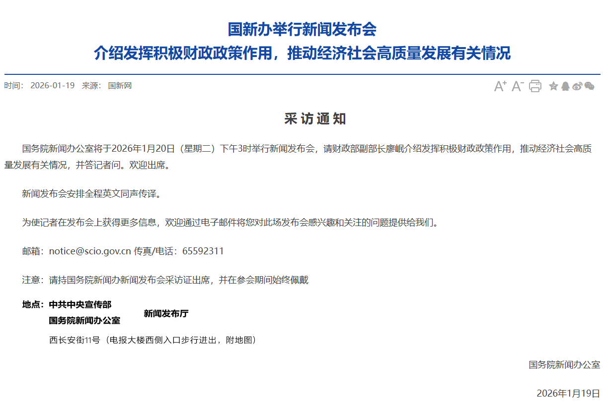另外,国务院新闻办公室将于2026年1月20日(星期二)下午3时举行新闻发布会,请财政部副部长廖岷介绍发挥积极财政政策作用,推动经济社会高质量发展有关情况,并答记者问。